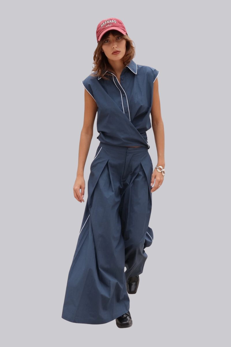 Crafted from breathable cotton poplin in a rich navy hue, the Cisco Shirt features relaxed tailoring and a contemporary wrap-front silhouette. Crisp white piping outlines the collar and seams, bringing soft definition, while tonal navy pearl buttons offer a refined finishing touch. The sleeveless cut enhances its lightweight feel, making it perfect for warm days or effortless layering throughout the seasons.