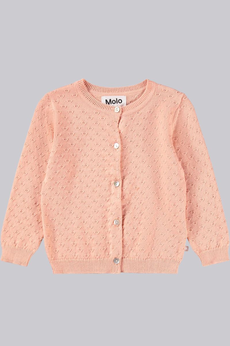 Rose knitted cardigan for the little ones made of organic cotton. The cardigan is knitted in a floral pattern, has a round neckline, ribbed edges and mother-of-pearl buttons down the front.