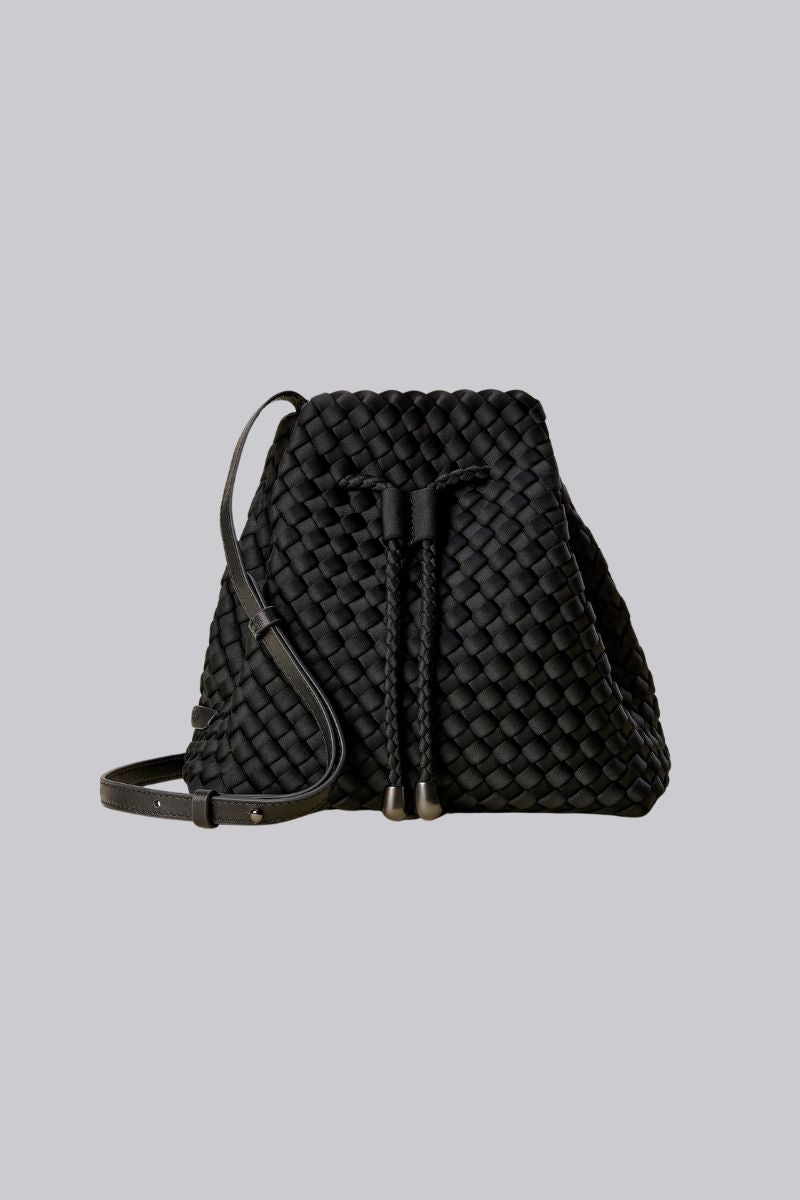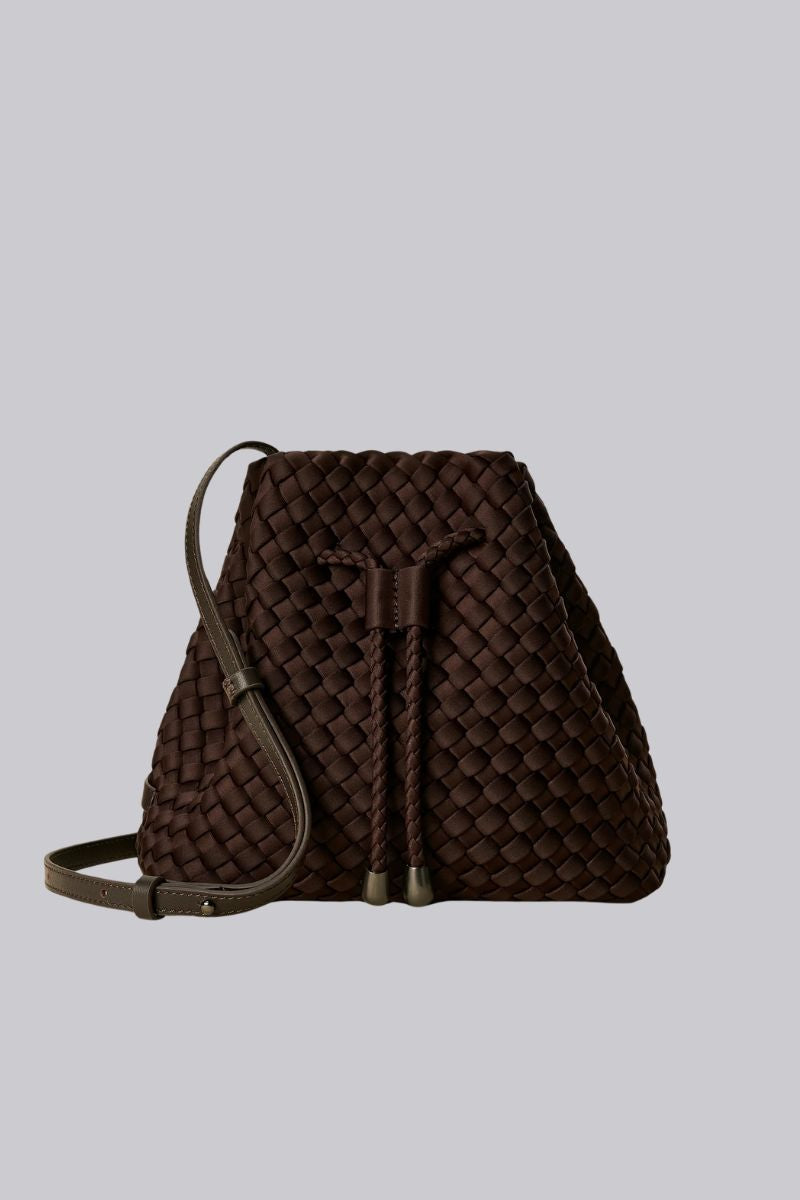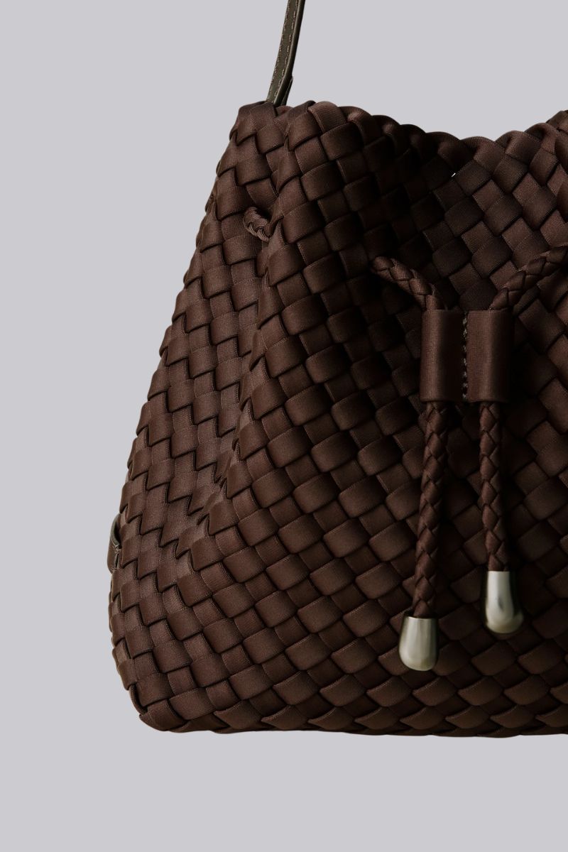 Handwoven neoprene in dark chocolate brown. Functional and modern, the Gramercy Medium Bucket is our newest handwoven bag—a polished, hands-free style featuring a drawstring closure and adjustable leather crossbody strap, perfect for carrying your daily essentials with ease.