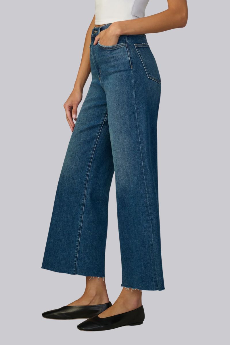 A high rise and slim fit through the waist and hip with a wide leg that hits at the ankle.