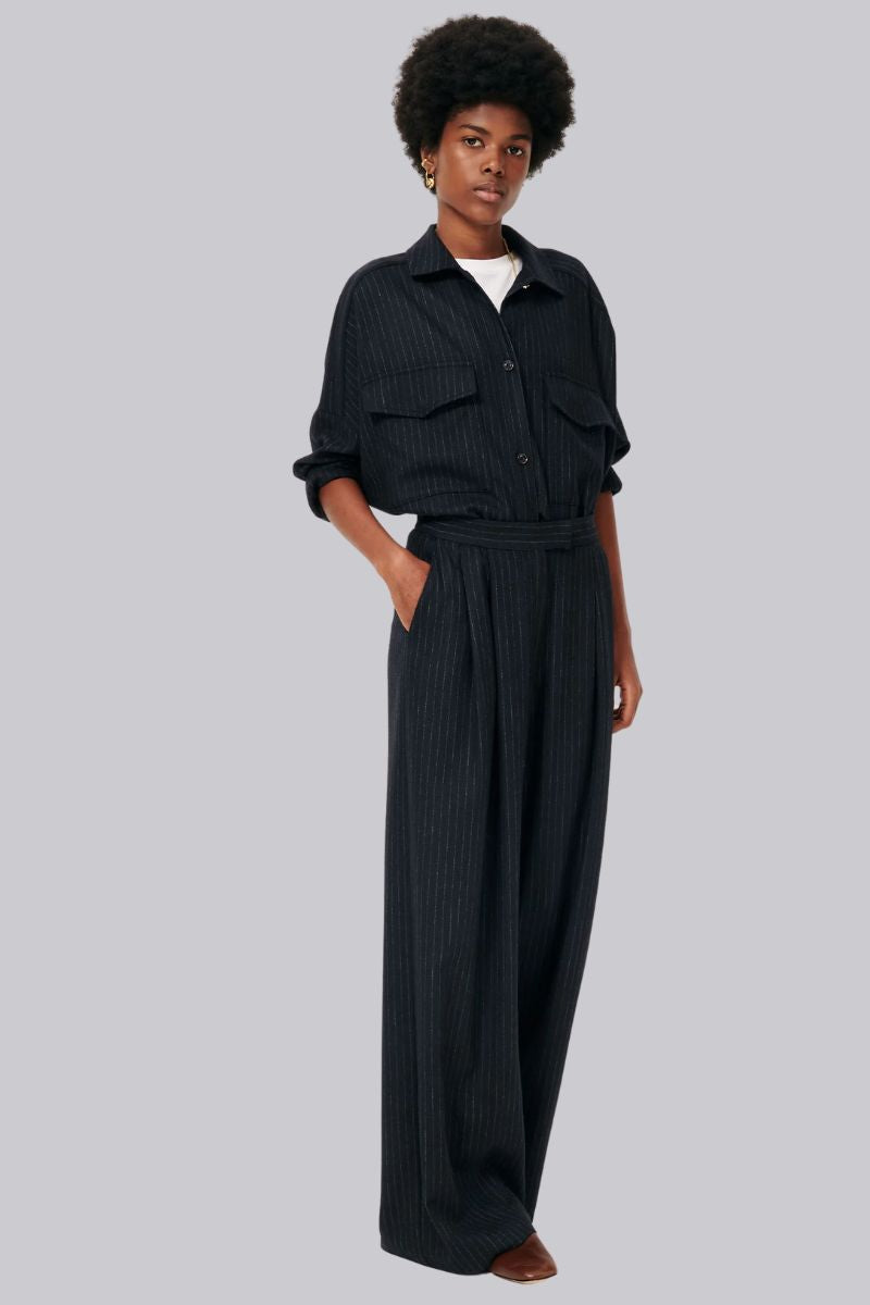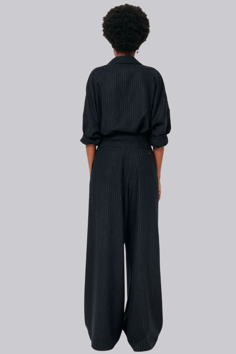 Pleated wide-leg trousers in chambray-effect flannel twill with tennis stripes, woven in Italy.