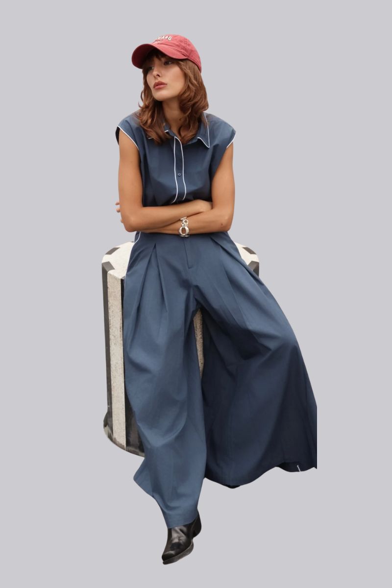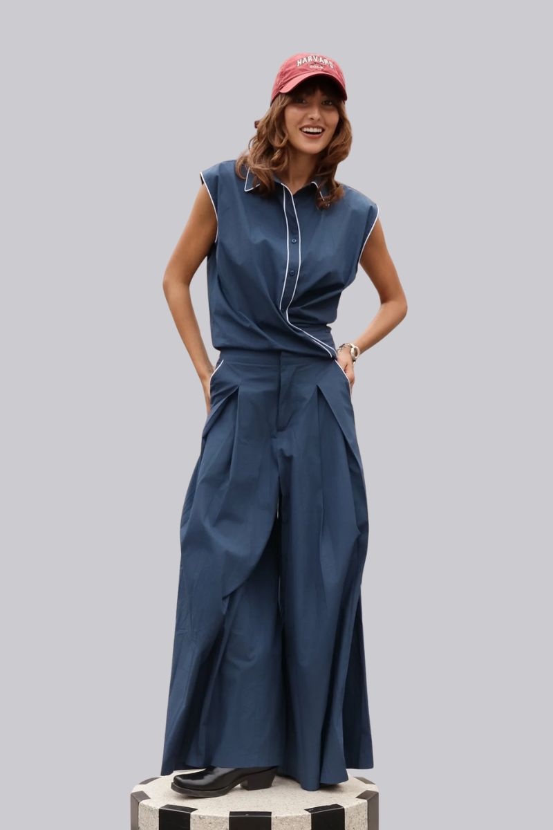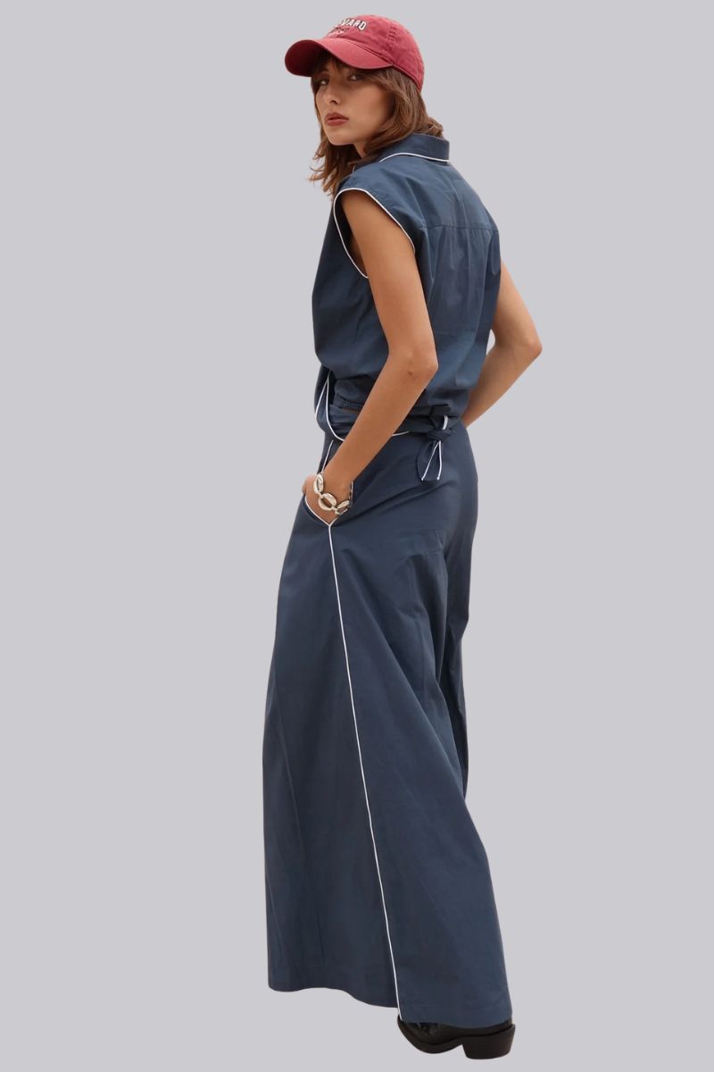 Where structure meets statement, the Palazzo Pant delivers modern tailoring with everyday ease. Designed in a classic navy cotton and finished with crisp white piping, this wide-leg silhouette brings a sharp edge to laid-back style.