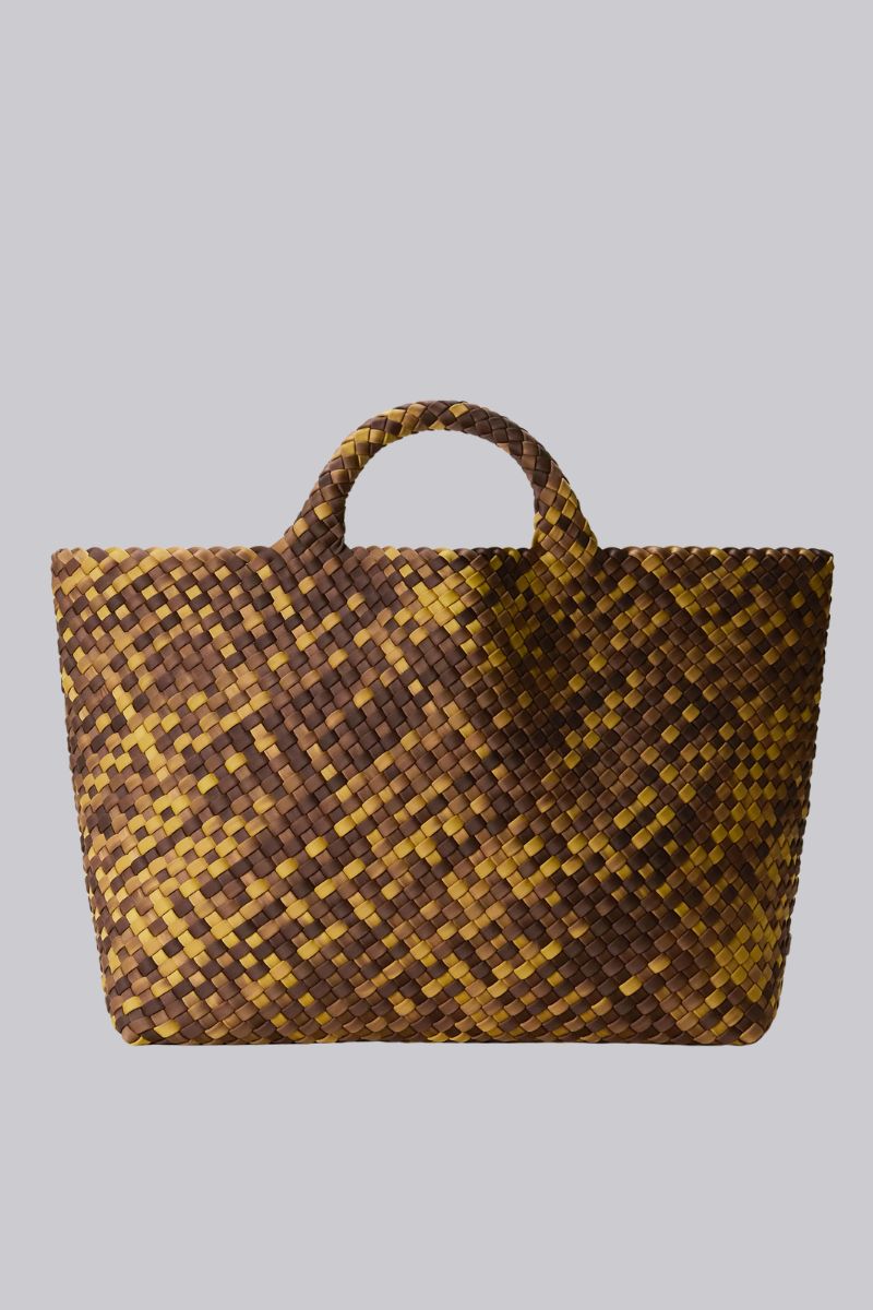 Handwoven neoprene in Citrine and Chocolate watercolor. The St. Barths Large Tote is a lightweight and versatile classic, ideal for travel and the beach.