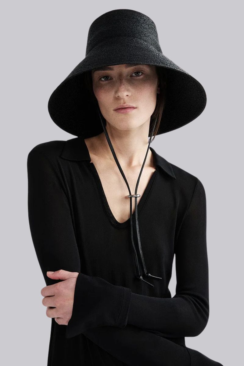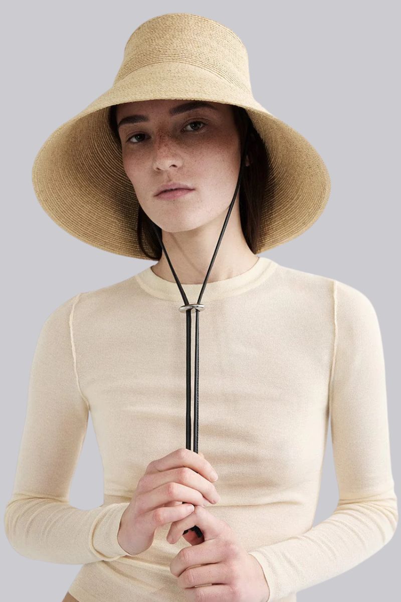 Handcrafted in Madagascar from 100% raffia straw, the Suni Bucket returns with thoughtful updates to its signature design. The familiar telescope crown and wide brim are paired with a new black regenerative leather chin strap, finished with silver hardware and an engraved organic cast stone detail. Designed for sun protection and everyday wear, Suni offers a considered balance of structure, comfort, and adjustability.